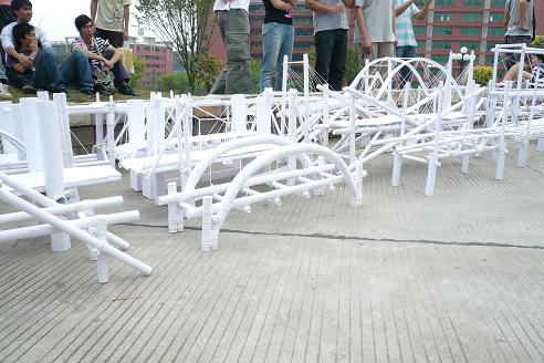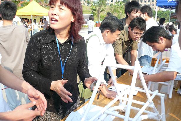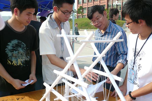 参与本次比赛的队伍共有29支,其中大一8支、大二15支、大三6支,参赛者来自土木工程、工程管理、工程造价、房地产开发及国土资源管理5个专业,比赛材料仅限大赛提供的180gA0制图纸、乳胶及建筑棉线,参赛作品均由参赛者自行设计及制作,在叶伟年等专业老师的指导下,同学们成功地完成模型并于4月7日作现场展览,4月8日作模型加载。其中来自05土木班力天世纪队、06土木2班的第七队、06工管3班的志在参与队、05土木班的牛屎队以、06工管1班的黄河8号以及来自07工管3班的9527队的参赛作品最大承载重量远远超过了大赛预定的承载上限60KG,更有高达80KG.的。