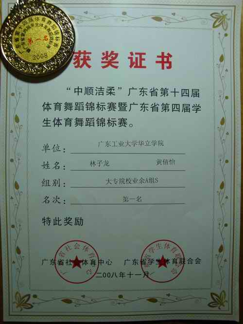 2008年11月29、30日 ,由广东省社会体育中心、广东省学生体育联合会主办的2008年广东省第十四届体育舞蹈锦标赛暨广东省第四届学生体育舞蹈锦标赛在中山市小榄镇体育馆举行。来自广州、深圳、佛山、汕头等地区的33支代表队以及来自广东体育学院、华南师范大学、广东医学院、江门五邑大学、广东工业大学等高校在内的2000多对选手分别参加了职业组和业余组摩登舞、拉丁舞51个组别的角逐。在学院领导高度重视和教务处、学生处、团委和各系部的大力支持下,广东工业大学华立学院参赛选手(六对)经过一个多月的辛勤准备,在石俊杰老师的带领下,于本次大赛中获得了大专院校业余A组标准舞冠军(A组为该系列最高级别,此前冠军一直为华师大保持),大专院校业余B组标准舞冠军、亚军和大专院校业余单项组标准舞冠军的优异成绩,是国标队有史以来参赛获得的最好成绩。其中,