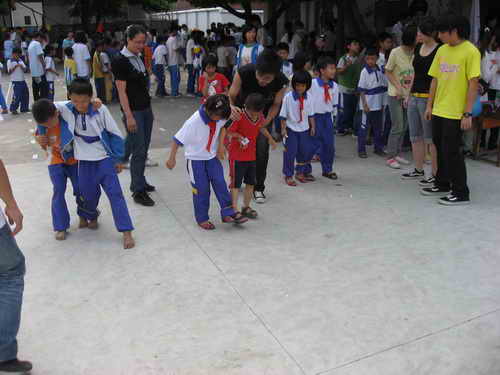 本次游园会内容丰富多彩,一共有14个不同类型的游戏:盲人过河、二人三足、夹波子、比比谁的运气好、画龙点睛、点水乒乓、掌上明珠……光是这些游戏的名称就足以勾起小朋友们的参与欲望,整个校园洋溢着节日的欢乐气氛,小朋友们个个玩得不亦乐乎。有些在聚精会神地夹波子,有些眯着眼瞄准目标在往瓶口投筷子,二人三足最有趣了,讲求的是两人的合作性,少一点默契都会输。这边画龙点睛,那边摸鹿鼻子,一处比比谁的眼力好,一处掌上明珠。