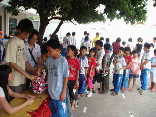 各个游戏区人头攒动,一派热闹景象。一个个生动有趣的游戏,把小朋友深深吸引住了,兑奖区更是人声鼎沸,小朋友们个个高举印有蓝天义工会徽的兑奖劵,排着队领取小奖品,发自内心的笑容洋溢在每个小朋友稚嫩的脸庞上,欢乐伴随小朋友们度过这个愉快的六一。