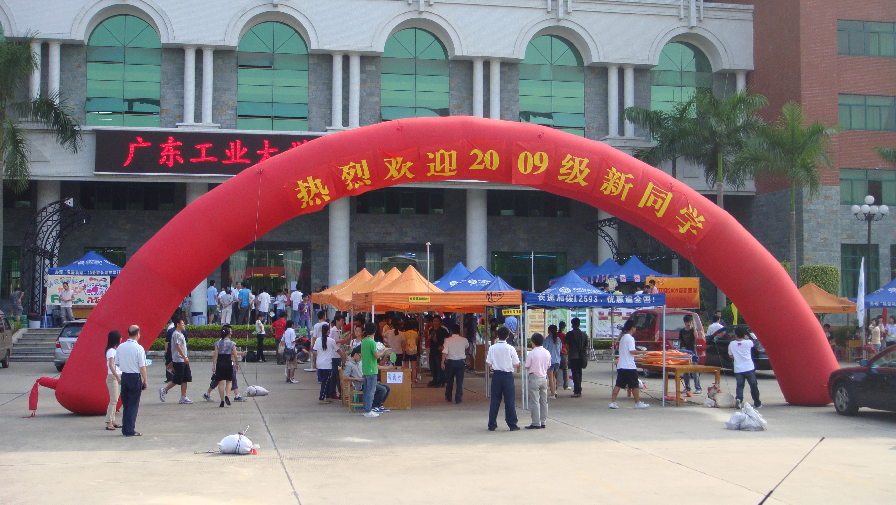 “金秋送爽喜迎八方学子,荔香飘韵共祝美好明天” 2009年9月4日,我院迎接新生工作正式拉开帷幕。据了解,我院今年的录取工作取得了可喜成绩,共招了3935名本科新生,其中外经贸学部招生人数最多,约占总人数的22%。建筑学部,管理学部和会计学部人数相当,机电学部和计算机学部人数则相对较少。