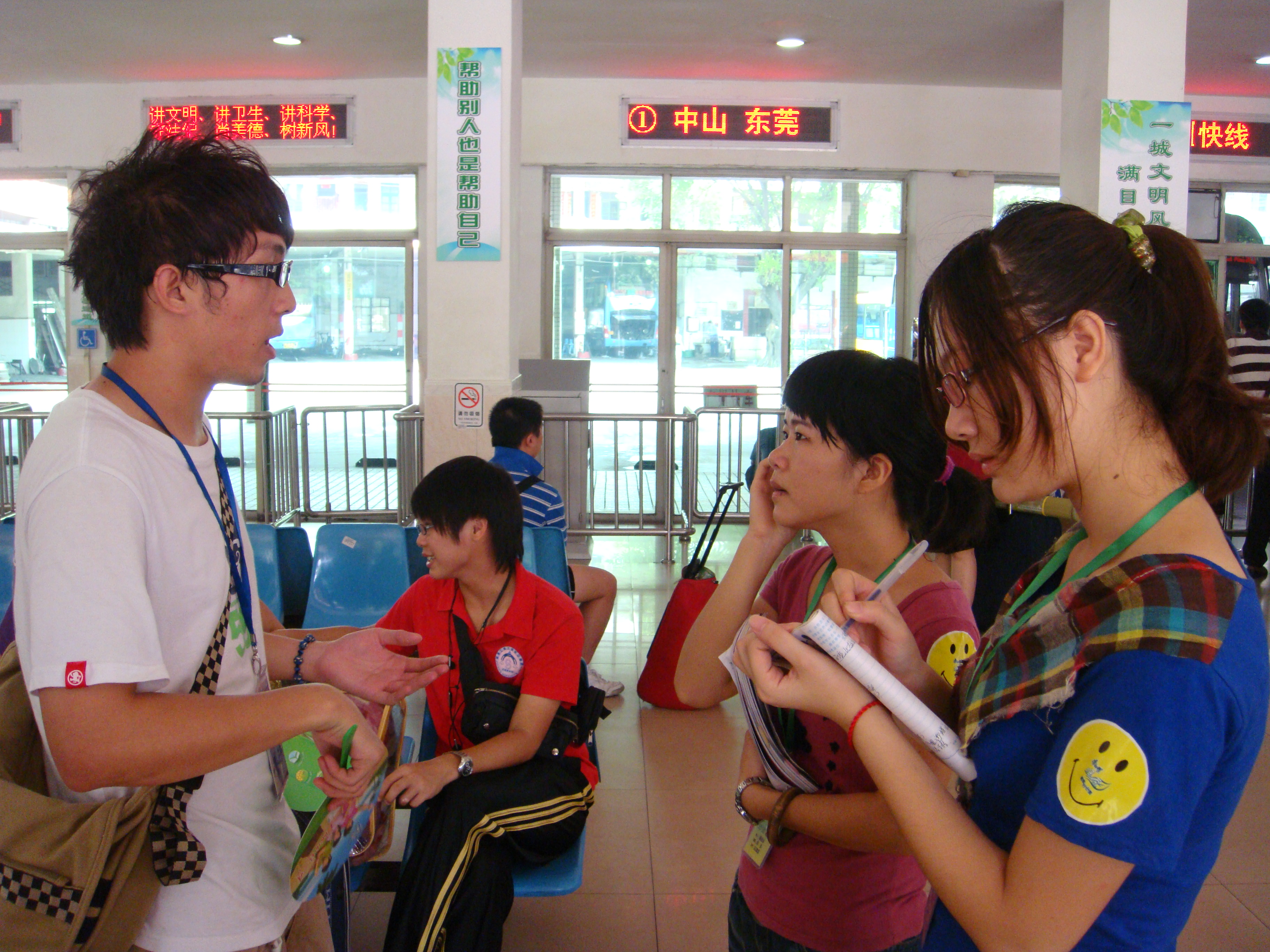 广东工业大学华立学院2009年的迎新工作于9月4日正式拉开序幕,学院在本次工作中展现出饱满的热情和蓬勃的生气。在全院师生的周密安排、团结协作下, 09级新生和新生家长得到了贴心细致的引导与服务。 特别是到各车站迎接新生的工作人员,更是顶着酷暑炎热,耐心地为他们提供帮助。他们的工作进行得怎样呢?我院学生会信调部的同事们在车站现场采访到了几位辛苦忙碌的学生干部代表,以下是采访的内容。