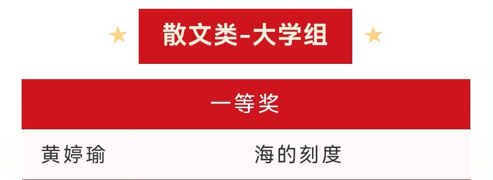 黄婷瑜同学的作品《海的刻度》以细腻笔触追寻革命足迹,深刻诠释了革命精神的时代价值,展现了我院学子深厚的文学素养与坚定的理想信念;隋丽丽老师在创作指导过程中悉心点拨、精准引领,充分彰显了优质的教学指导水平。