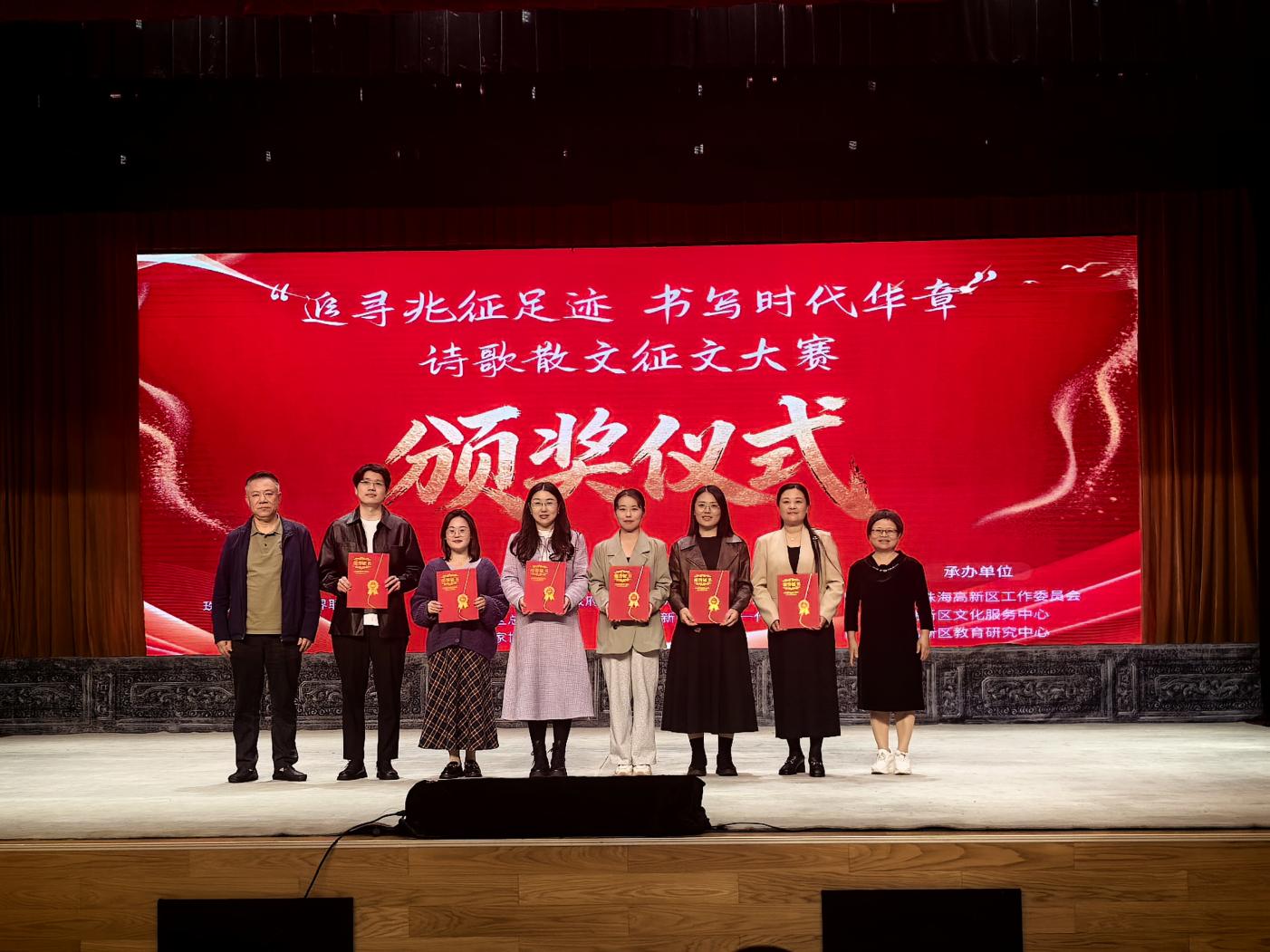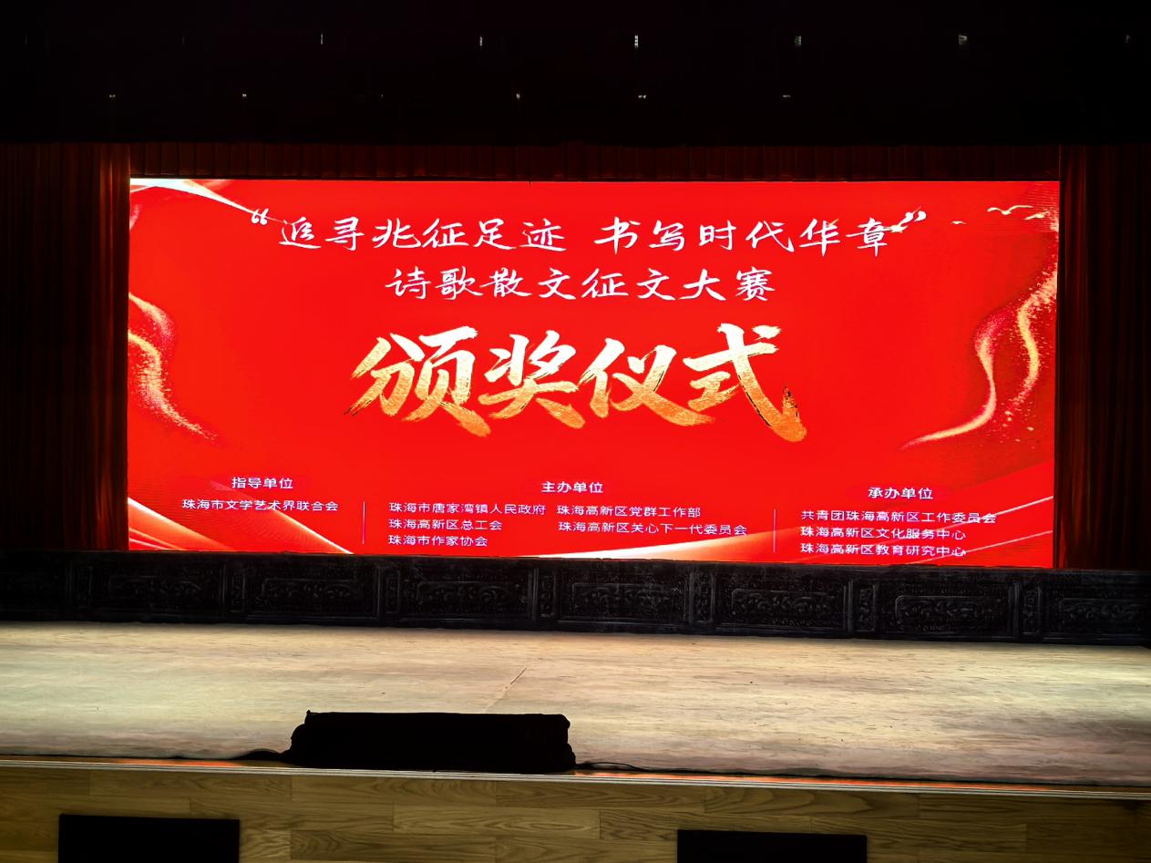 近日,由珠海市唐家湾镇人民政府、珠海高新区党群工作部等单位主办,共青团珠海高新区工作委员会等承办的“追寻兆征足迹 书写时代华章”诗歌散文征文大赛圆满落幕。我院2024级学子黄婷瑜凭借散文作品《海的刻度》脱颖而出,荣获散文类—大学组一等奖,隋丽丽老师获评“优秀指导老师”。
