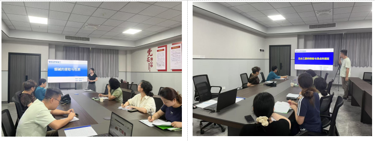本次磨课活动聚焦本学期承担《有机化学实验I》教学任务的两位青年教师。首先进行汇报的是吴佳钰老师,她以"烟碱的提取与性质"实验为主题开展教学。课程从"烟碱(尼古丁)作为烟草中天然生物碱的特性及其成瘾性"这一生活实例导入,系统讲解了烟碱的理化性质、提取方法、水蒸气蒸馏原理及操作要点。吴老师教学热情饱满,课件设计图文并茂,将复杂实验过程分解为简明易懂的操作步骤,特别注重将安全教育贯穿教学全过程,通过设置课后思考题强化学生的安全意识。