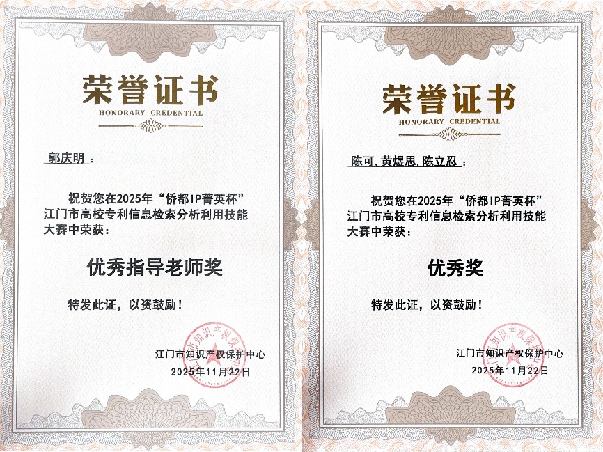 近日,2025年“侨都IP菁英杯”江门市高校专利信息检索分析利用技能大赛决赛在江门市图书馆圆满落幕。本次大赛自启动以来,吸引了江门地区多所高校,230多支队伍踊跃参与。经过初赛的激烈角逐,全市高校共15支队伍脱颖而出,进入决赛现场。其中,广州华立学院药学院代表队“华立050队” 凭借扎实的专业素养与现场的出色表现,最终荣获优秀奖,郭庆明老师荣获优秀指导老师奖。