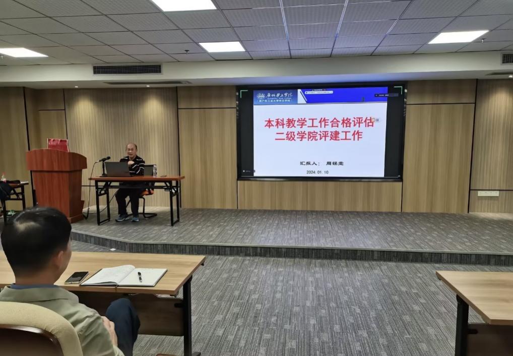 2024年1月16日下午,学校在国际学院报告厅举行合格评估评建工作讲座。各二级学院领导、院办、学工办、教学办领导和系主任现场参会,江门校区各学院的同志通过远程视频参加会议,报告由教学质量监控与评估中心主任周锡堂主讲。