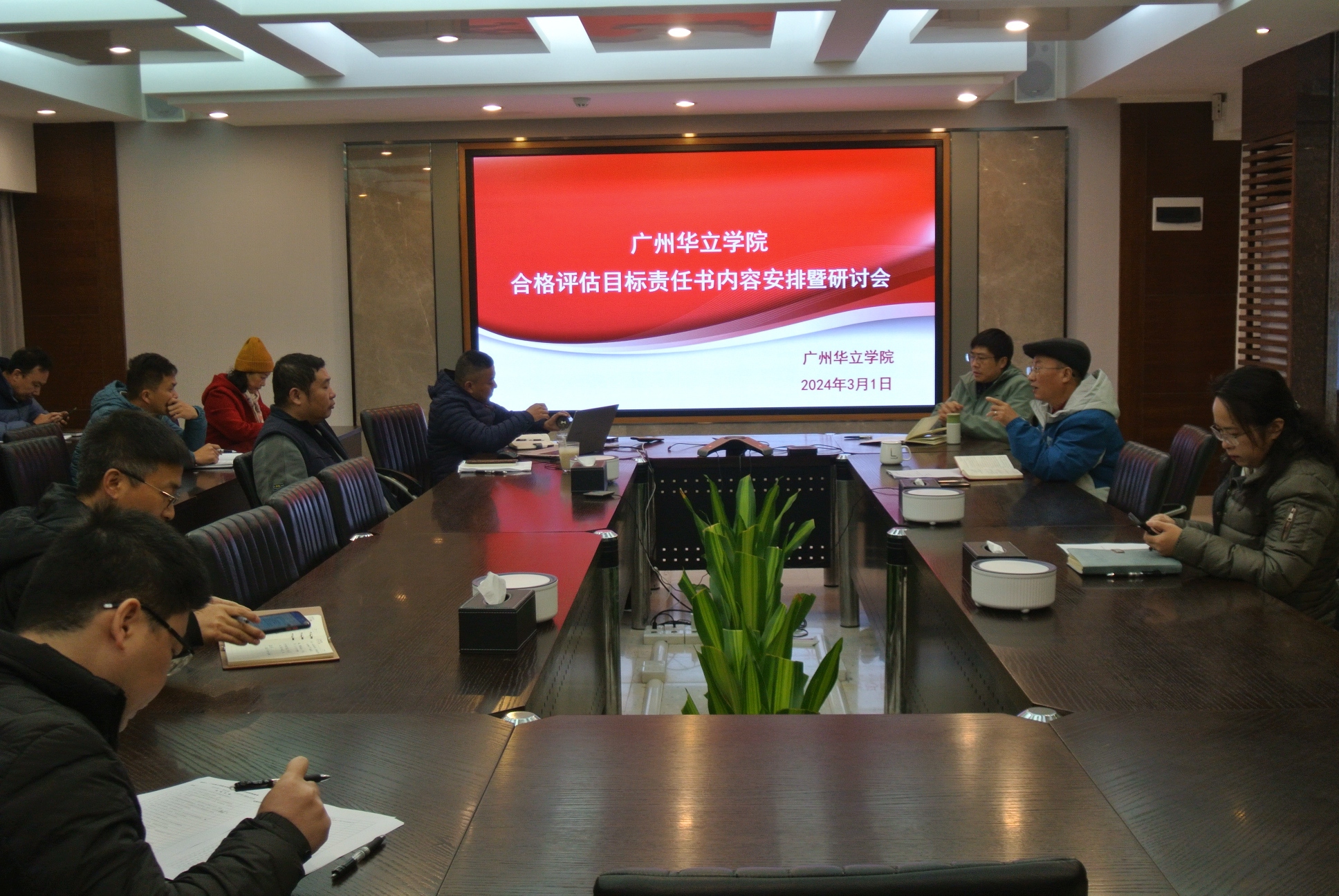 2024年3月1日上午,学校在会议室召开会议,就合格评估目标责任书相关内容进行研讨。职能部门负责人及质评中心相关人士参加,副校长欧洁梅主持会议。