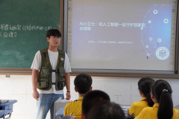 为深入推进“百千万工程”,助力地方实现高质量发展,切实筑牢青少年信息安全防线,2025年5月20日下午4时,智能科学与工程学院“百千万工程”突击队再度走进崖南镇田边小学,开展了一场以“AI小卫士:和人工智能一起守护国家安全城堡”为主题的科普宣讲活动。此次活动由学院肖汇老师领队,六芒星小分队积极响应。由队长莫德惠以及队员周依灵、李高诚、刘铧聪、王浩宇、罗爱君组成的志愿团队,通过寓教于乐的形式,为孩子们呈上了一场精彩纷呈的知识盛宴。