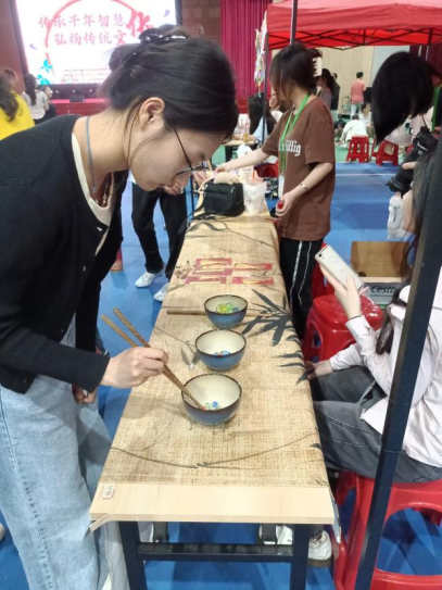 活动现场,筷子夹弹珠区域围满了跃跃欲试的同学,一双双竹筷在指尖灵活舞动,大家全神贯注地把弹珠从一个瓷碗夹向另一个瓷碗。有的同学动作娴熟,弹珠接连“归位”,引得围观者阵阵赞叹;有的同学稍显紧张,弹珠滑落时,现场便响起善意的笑声与鼓励。小小的弹珠,不仅考验着大家的手眼协调能力,更让同学们深切体会到传统筷子文化中蕴含的精细与巧思。