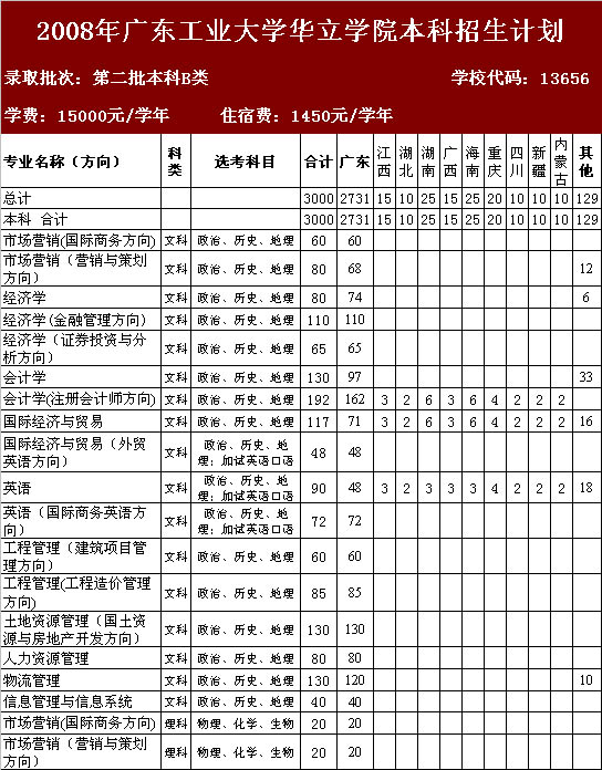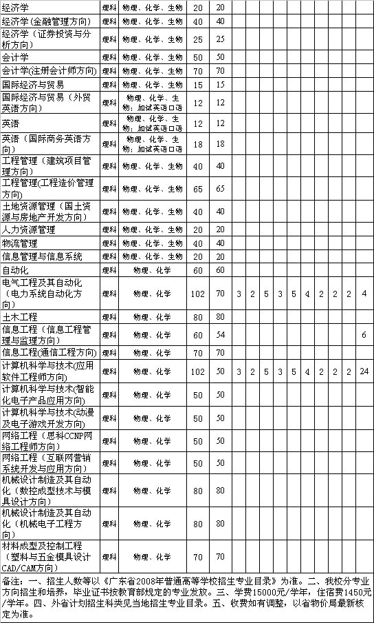 广东工业大学华立学院08年本科招生计划