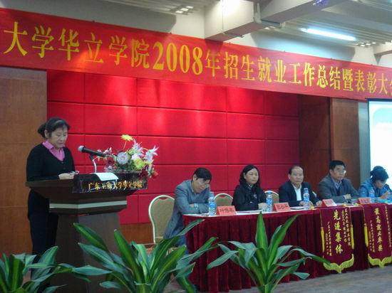 11月14日,学院在图书馆三号报告厅隆重召开2008年招生就业总结暨表彰大会。会议回顾总结了我院2008年招生就业工作的情况,对 2008年招生就业先进集体与个人进行了表彰,并就今后如何进一步做好招生就业工作进行了探讨。广州华立投资有限公司董事长助理张小平,学院常务副院长詹业宏,副院长邓则名,党委书记胡志先,办公室主任何淑珍,教务处处长叶伟年,各学部部长、书记、全体辅导员、08、09届毕业班班主任,以及全体招生及就业工作人员共90多人出席了大会,会议由党委书记胡志先主持。